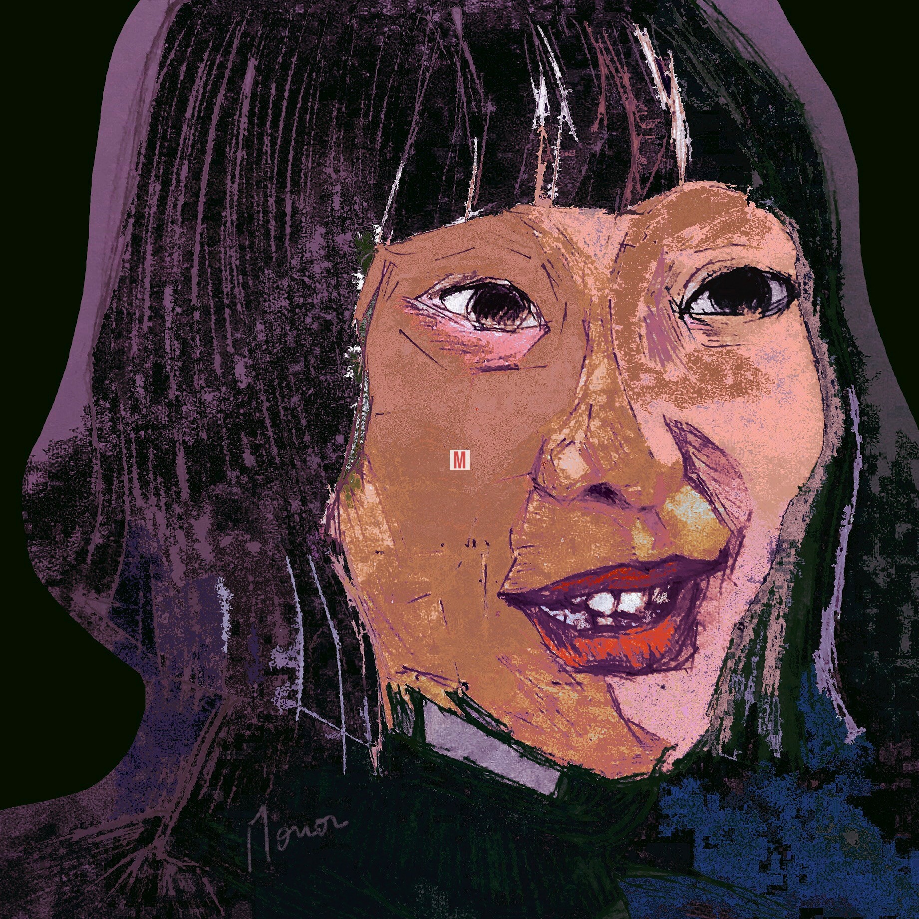 J’ai réalisé ce portrait de technique mixte à partir d’un dessin au crayon sur papier et d’une peinture numérique sur iPad. La technique de ce portrait numérique consiste alors à styliser sur tablette graphique le dessin numérisé puis à réaliser une impression sur dibond-alu (finition brillante pour avoir le rendu visuel de l’écran) avec un système de fixation murale en alu.